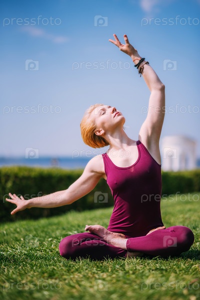 Красивая девушка медитирует в позе лотоса, сидя на траве в солнечный день