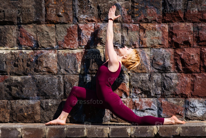 Красивая девушка занимается йогой на фоне каменной стены