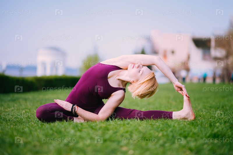 Девушка занимается йогой на зеленой траве в солнечный день