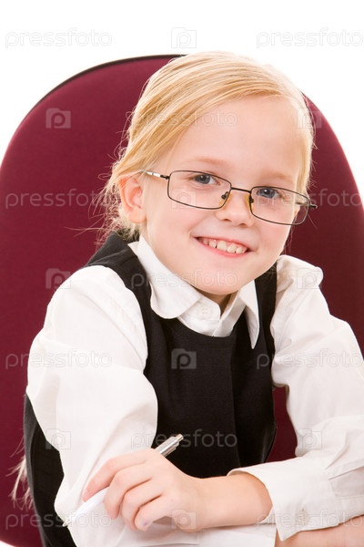 Портрет красивой девушки с ручкой в руке, глядящей на камеру