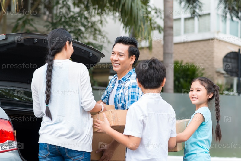 Семья складывает коробки