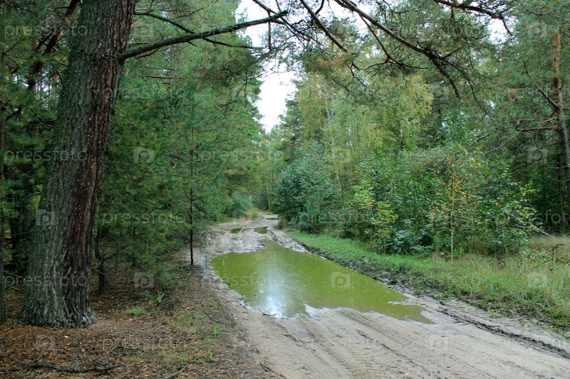 Дороги с грязью и лужей в лесу