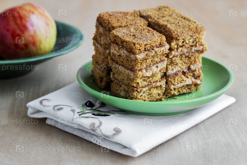 Торт, яблоко и грецкие орехи на тарелку