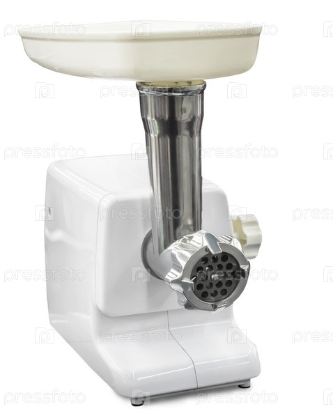 Современная электрическая мясорубка на белом фоне