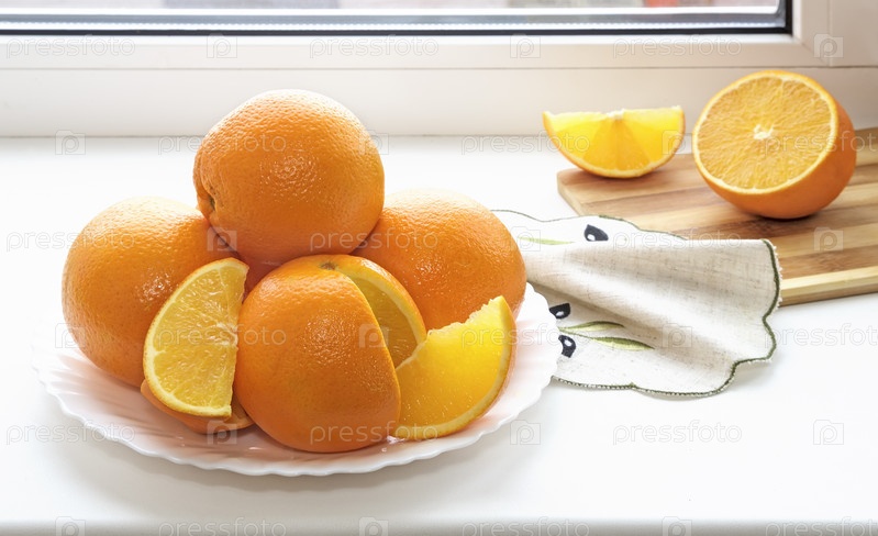 Апельсины на тарелке на подоконнике