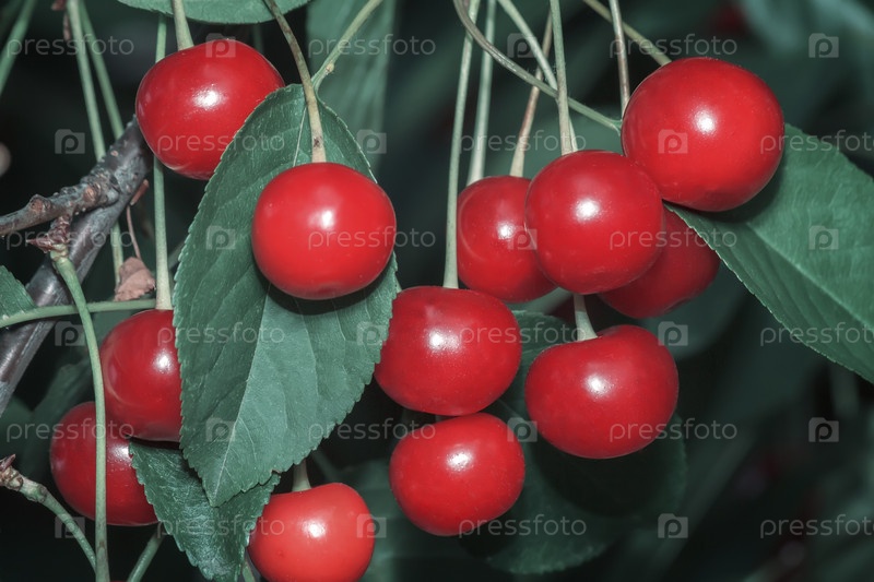 Спелые вишни на ветке дерева