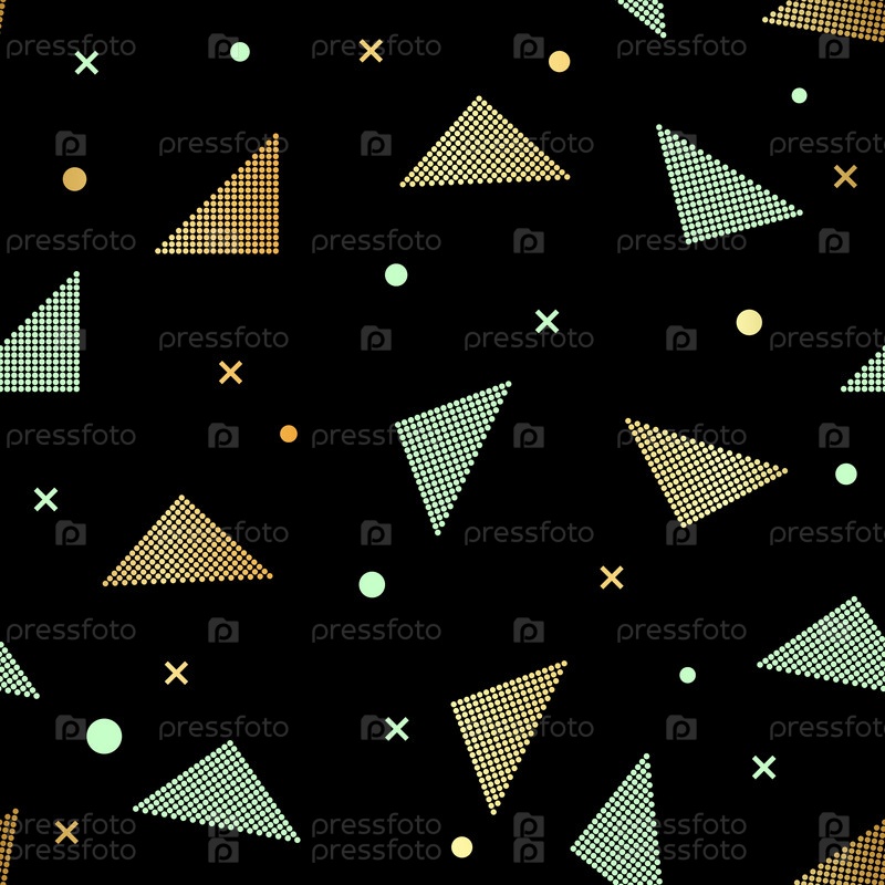 Абстрактный бесшовный повторяющийся рисунок с треугольниками в золотом блеске и черном на чёрном фоне