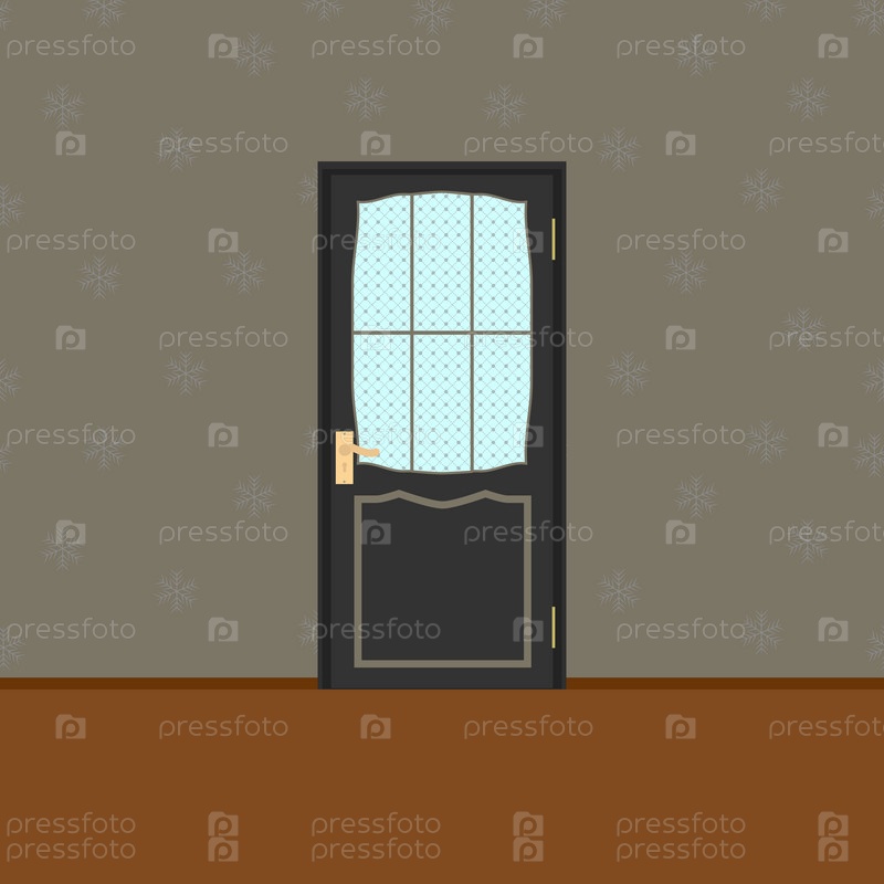 Векторная деревянная закрытая дверь с рамой изолирована на снежинке плавный фон