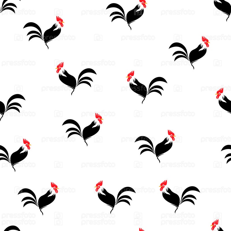 Силуэты бесшовного узора петуха изолировали белый цвет на черном.Символ Нового года 2017 по китайскому календарю