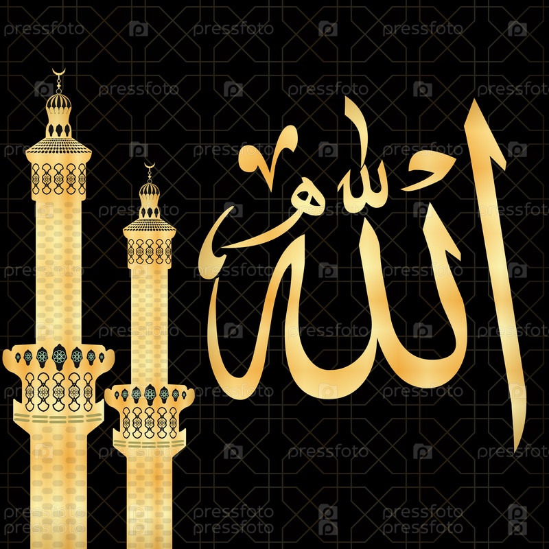 Аллах перевод Во имя Бога . Темный фон. Золотой геометрический исламский мотив или орнамент