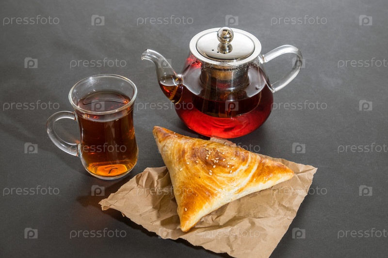 Чашка чая с пирогом и стеклянный чайник на черном фоне