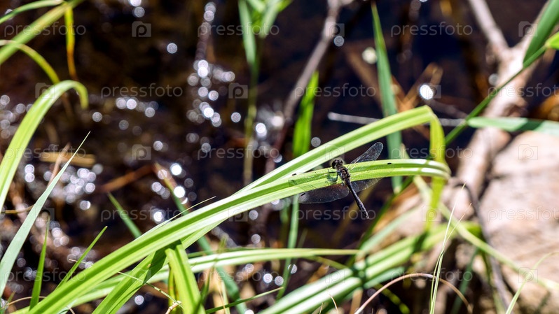 Черная стрекоза сидит на траве