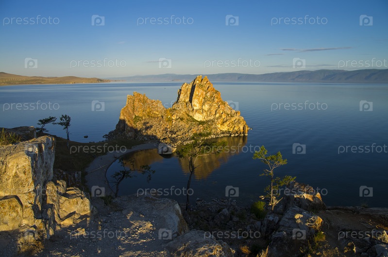 Скала Шаманка в лучах восходящего солнца. Остров Ольхон, Байкал