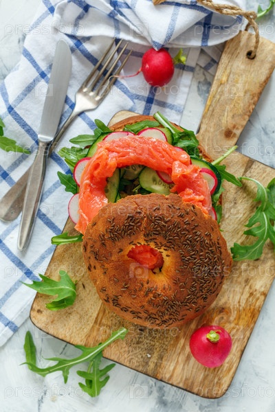 Бэйгел с тмина, ругулой, редисом и копченой форелью