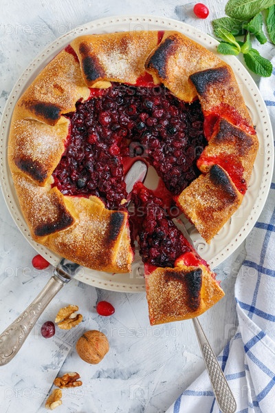Тарелка с нарезанным клюквенным пирогом свободной формы ((галеткой)