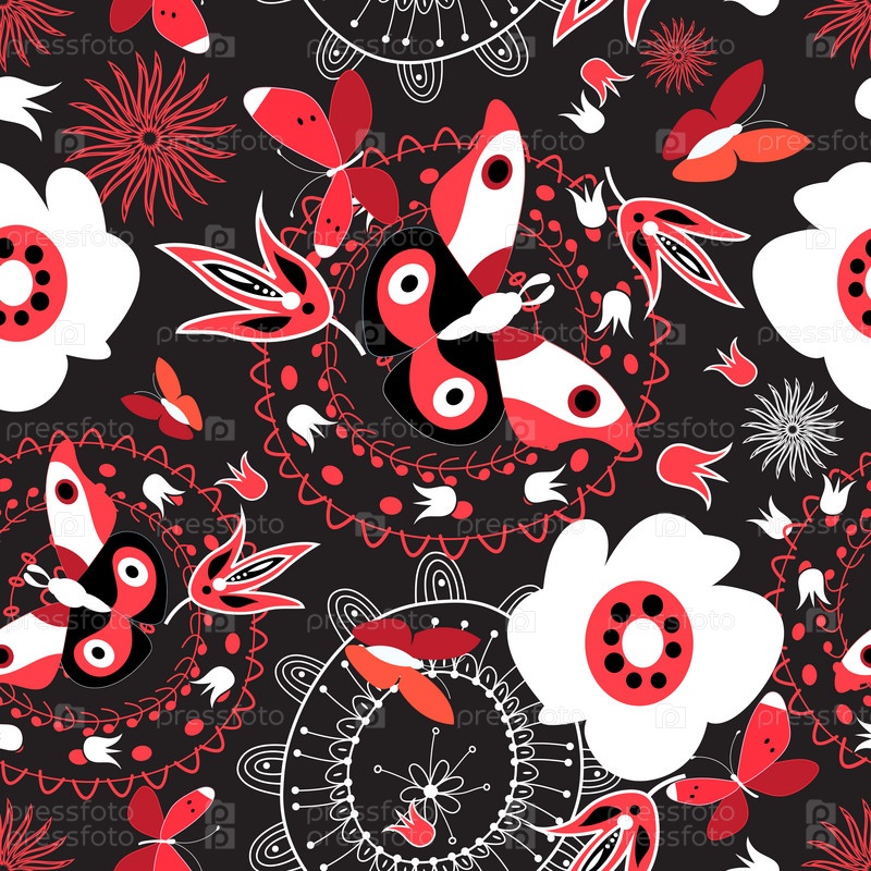 Бесшовный фон с бабочками и цветами