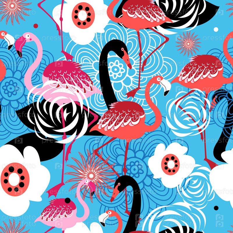 Яркий цветочный узор фламинго и лебедей