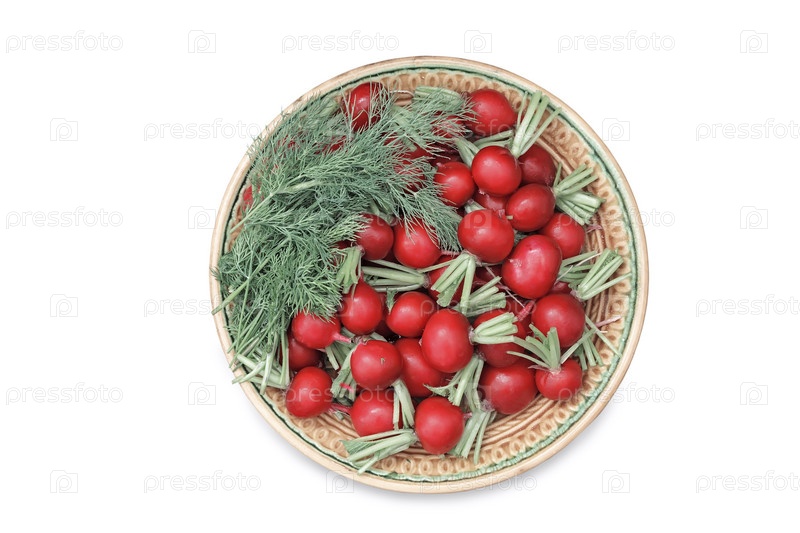 Редис и укроп на тарелке на белом фоне