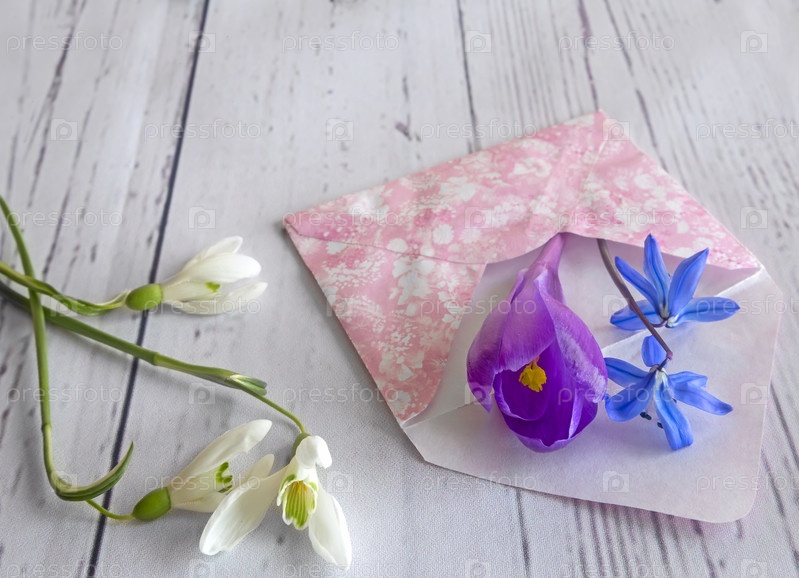 Весенние цветы на светлом фоне и конверт