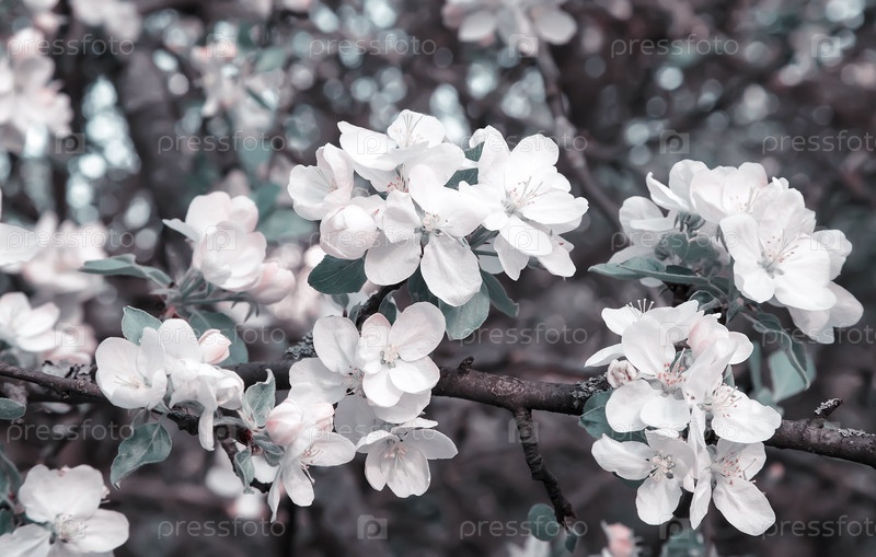 Цветение яблони на фоне зеленого сада