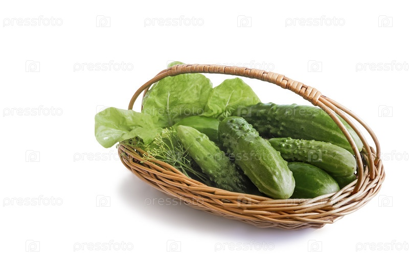 Корзина с огурцами на белом фоне