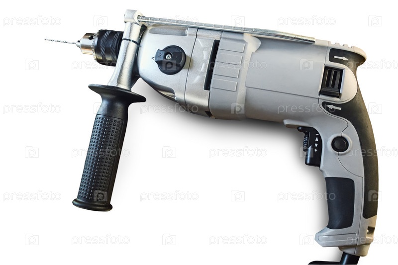 Электродрель со сверлом на белом фоне