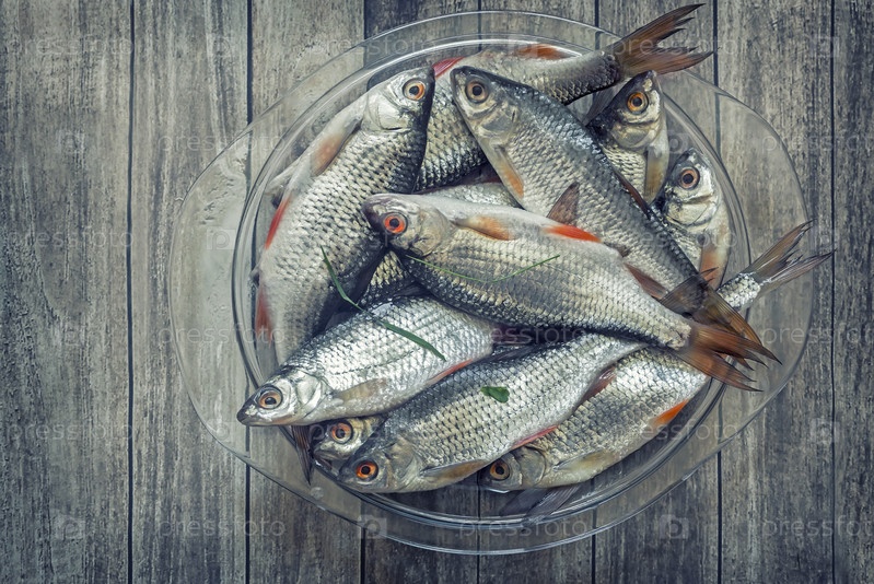 Свежая рыба на столе в стеклянной посуде