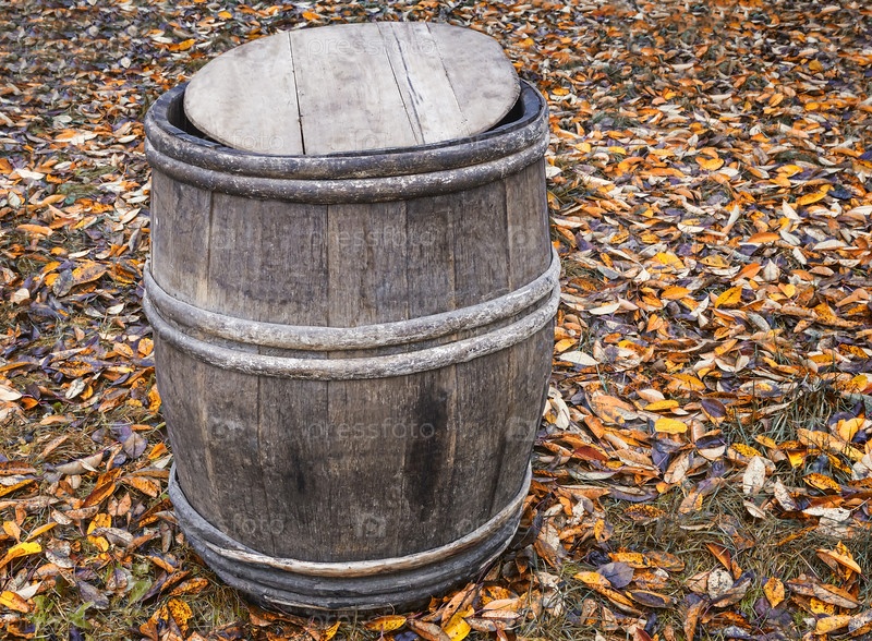 Дубовый бочонок на земле на фоне осенних листьев