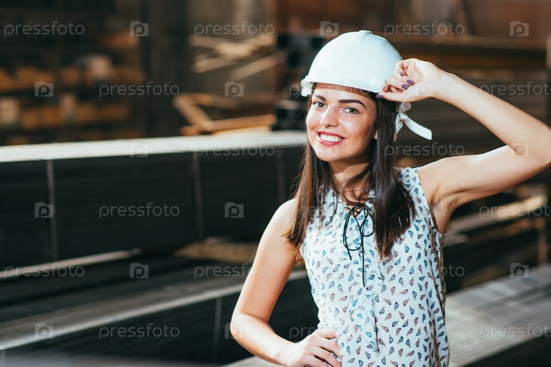Красивая девушка на складе рекламирует товары