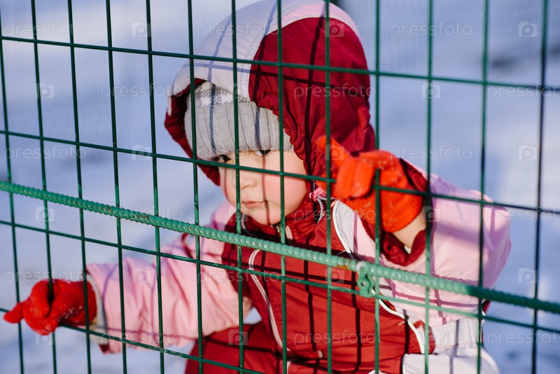 Маленький ребенок смотрит через забор