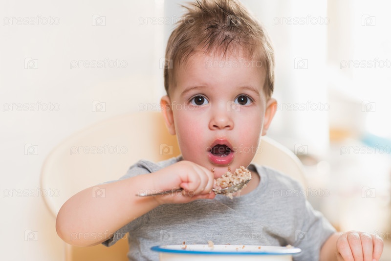 Ребенок ест гречневую кашу на кухне