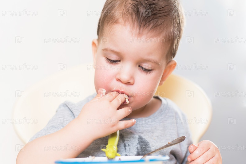 Ребенок ест гречневую кашу на кухне