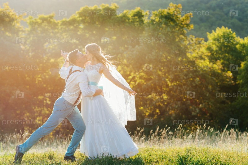 Жених и невеста фотографируются на природе