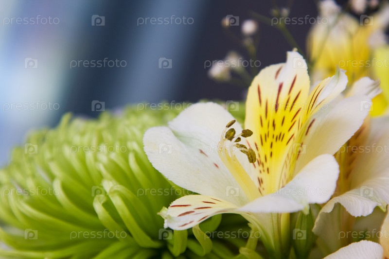 Цветок желто-белой лилии на фоне зеленой хризантемы