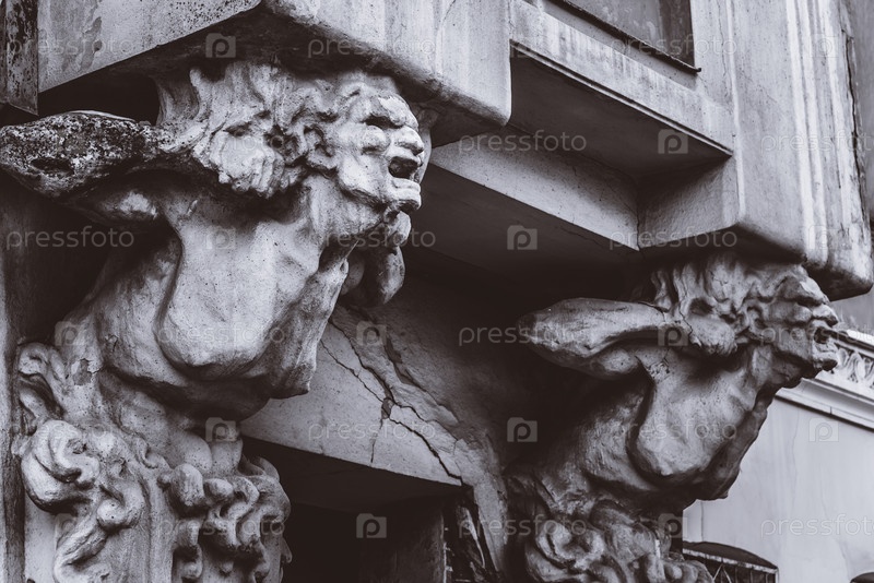 Бюст страшной женщины на фасаде старого дома