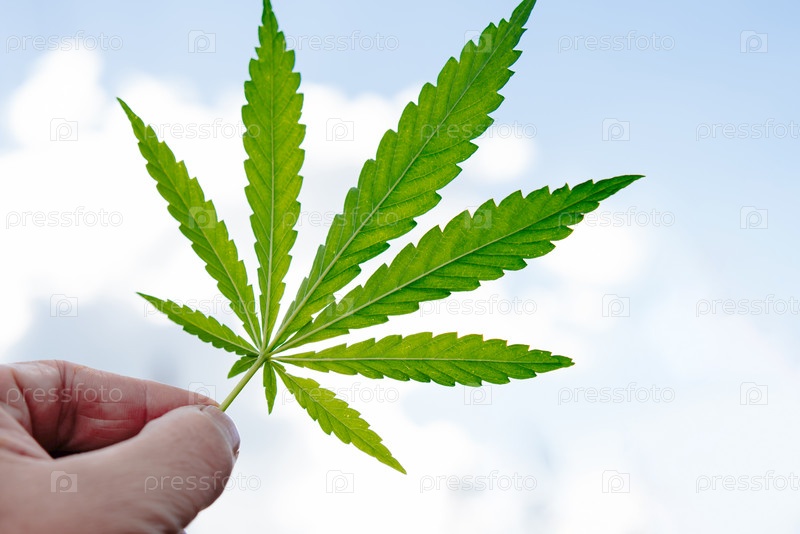 Парень держит лист конопли в руке