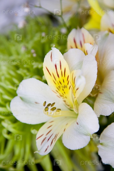 Цветок желто-белой лилии на фоне зеленой хризантемы