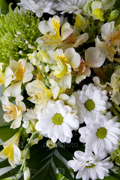 Букет цветов из желто-белых лилий, белых и зеленых хризантем