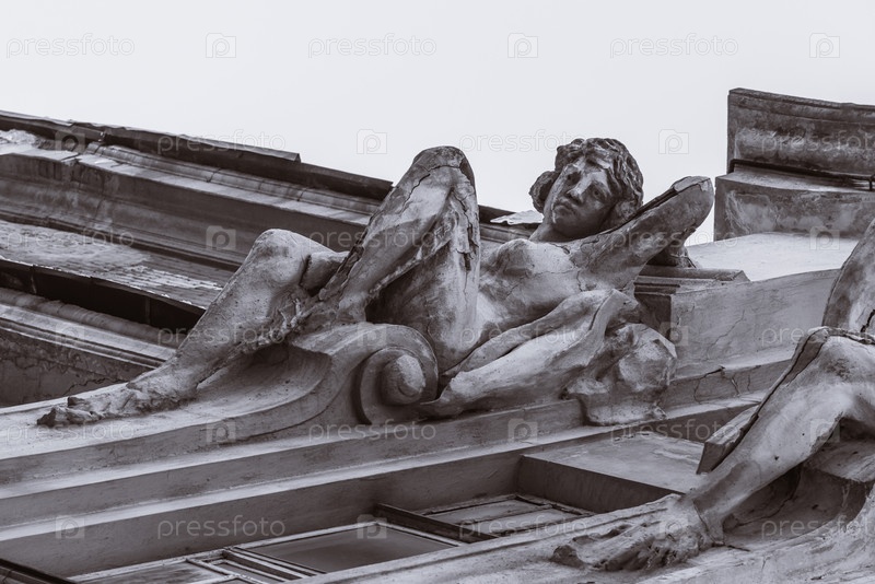 Две статуи из бетона украшают фасад старого дома