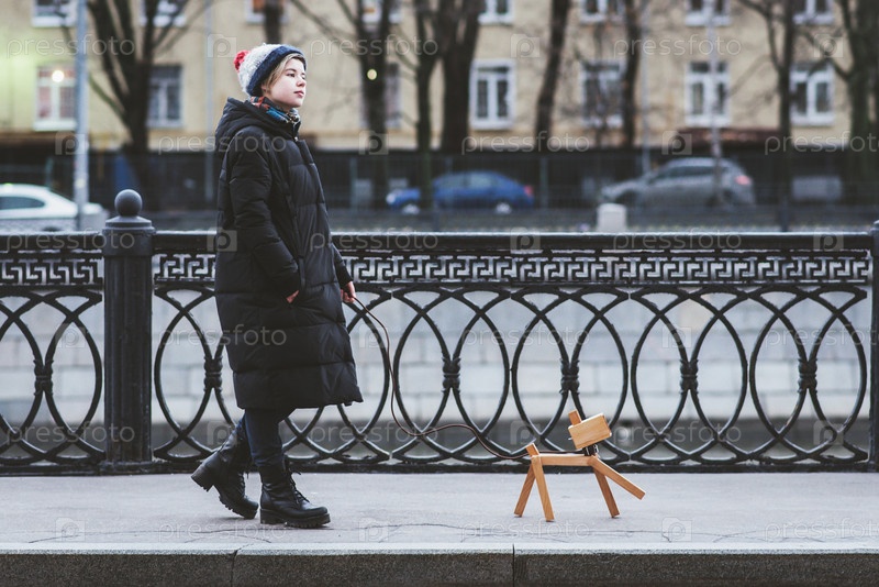 Девушка играет на улице с воображаемой собакой, которая на самом деле лампа