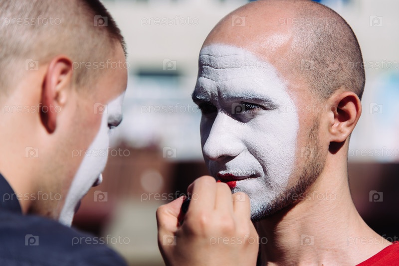 Мим делает макияж для своего партнера в городе