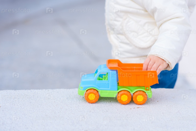 Ребенок играет с машинками на улице