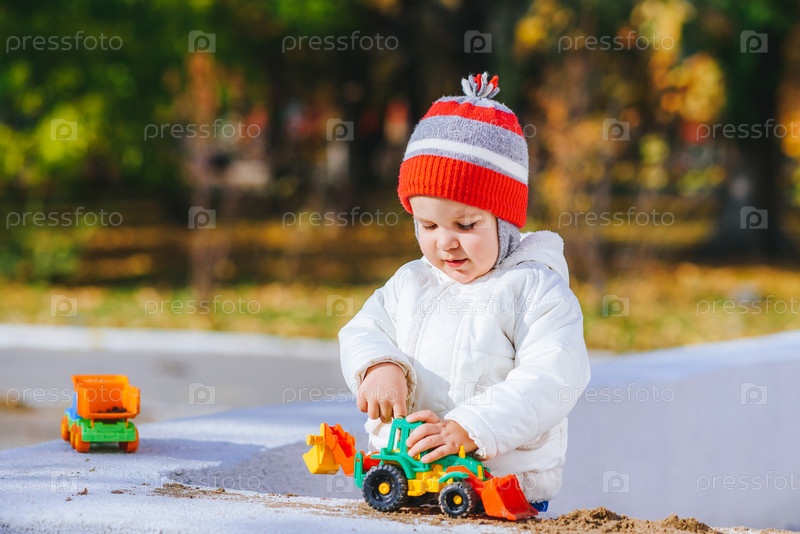 Ребенок играет с машинками на улице