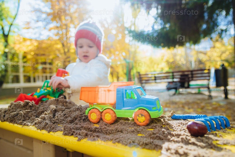 Ребенок играет с машинками в песочнице