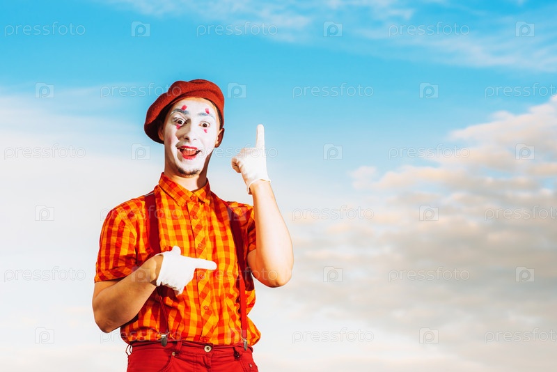 Мим показывает пантомиму на фоне голубого неба