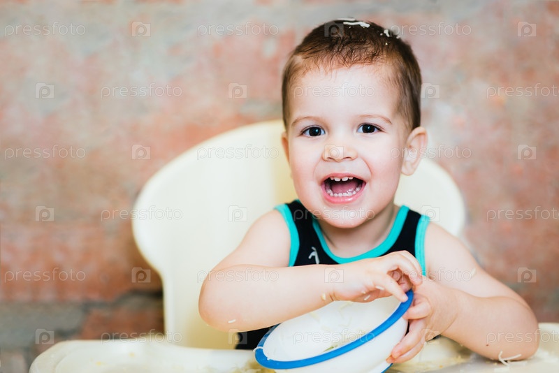 Ребенок в кухне есть вермишель с молоком