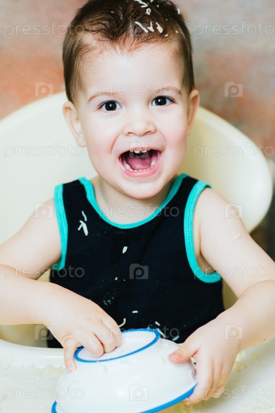 Ребенок в кухне есть вермишель с молоком