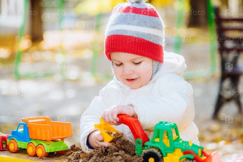 Ребенок играет с машинками в песочнице