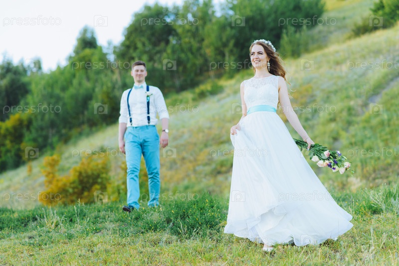 Жених и невеста фотографируются на природе
