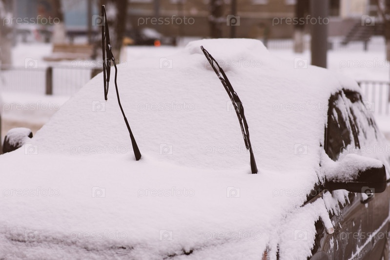 Автомобили паркуются вдоль дороги, покрытые снегом